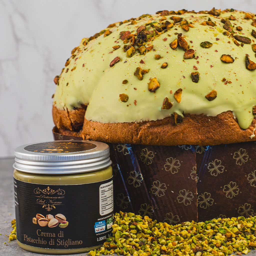 A rendere questa esperienza ancora più esclusiva è la presenza di un raffinato vasetto di crema spalmabile al pistacchio, dal gusto intenso e vellutato, da aggiungere su ogni fetta per esaltarne al massimo il carattere gourmet.